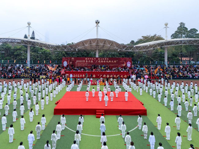 2月16日,第六届“广府庙会武林大会”在广州市越秀区东山体育场举行。作为广府庙会的系列活动之一,本次活动以“激情全运会 活力大湾区”为主题,融入十五运会和残特奥会吉祥物、会徽和主题口号等丰富的体育文化元素,吸引了近千名市民现场观摩。
